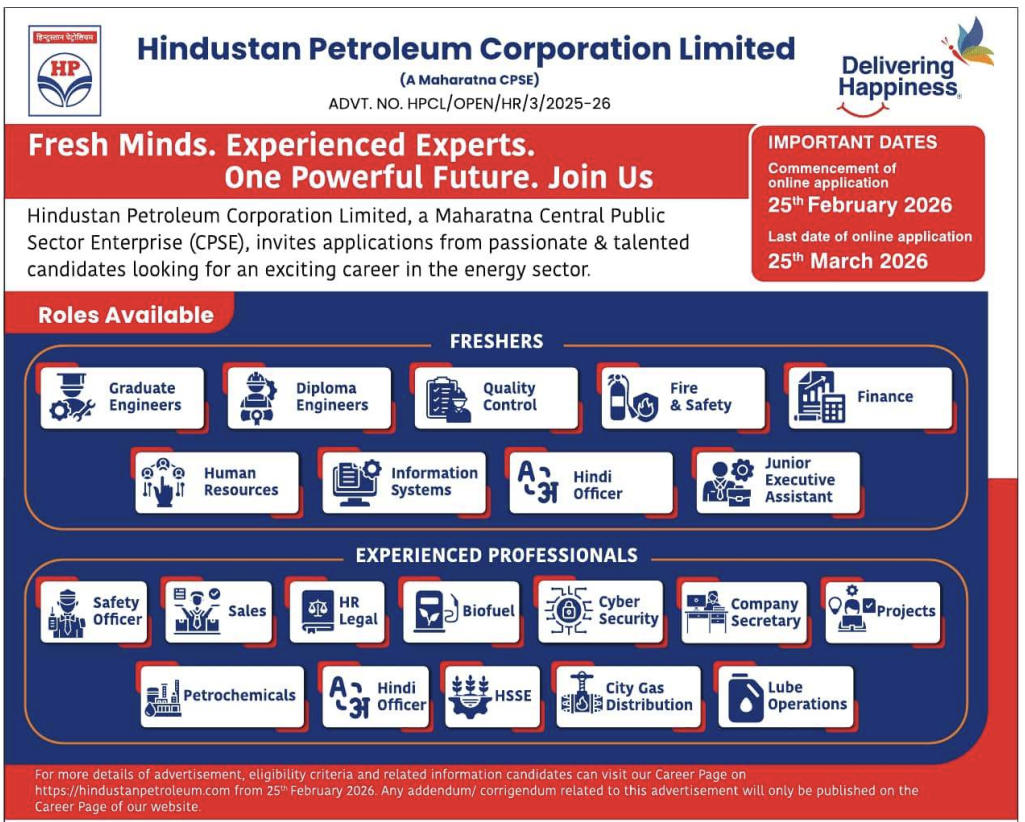 HPCL Recruitment 2026; The Hindustan Petroleum Corporation Limited (HPCL) has released a short HPCL Recruitment 2026 Notification to recruit eligible candidates for various Freshers & Experienced Professionals posts. The number of vacancies will be released soon, along with the detailed notification PDF. The online application process will start from 25th February 2026 onwards at the HPCL official website www.hindustanpetroleum.com. For more details, candidates must go through this article.