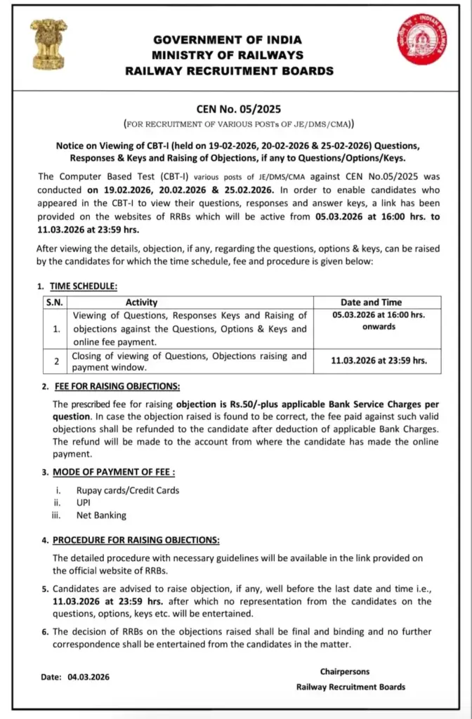 Railway Recruitment Board (RRB) has released an official notice notifying the release date and raising objection dates for RRB JE Answer Key on 4th March 2026. The official answer key will be released on 5th March 2026 at 4 pm. Check official notice attached below.